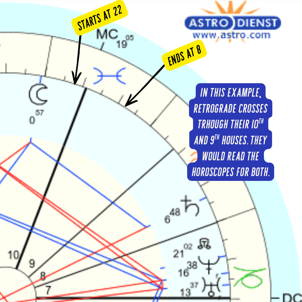 Before you read your horoscope, find the house of Pisces in your birth chart on astro.com. Locate the distance between 22 to 8 degrees; that’s the range of this retrograde. (Click here for my free tutorial on identifying a transit.)